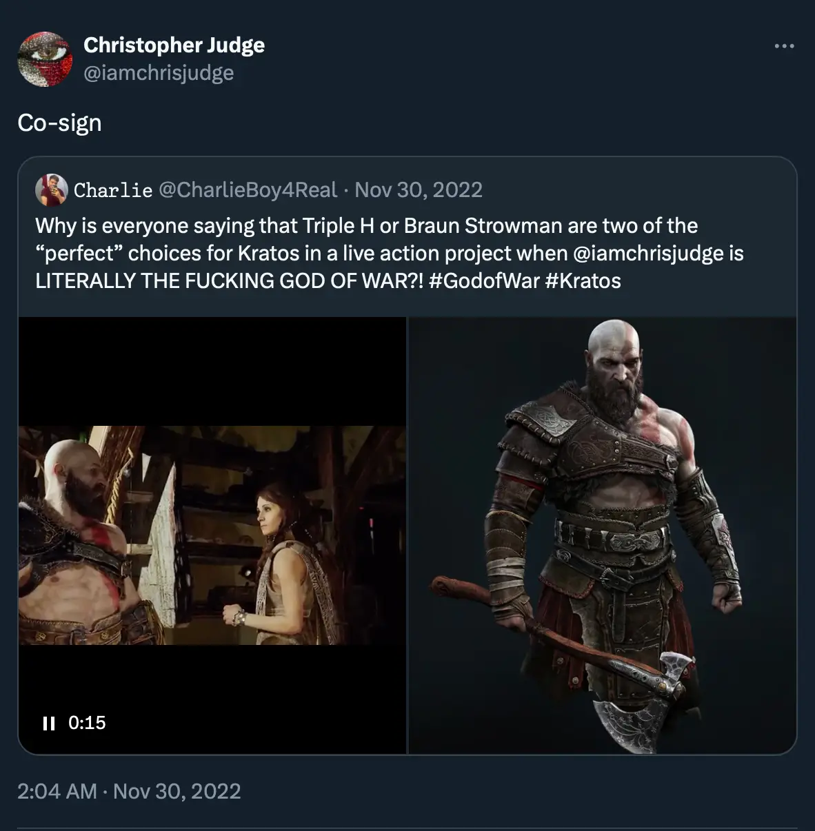Back in 2022, a post on X (formerly known as Twitter), stated: “Why is everyone saying that Triple H or Braun Strowman are two of the “perfect” choices for Kratos in a live action project when @iamchrisjudge is LITERALLY THE F*****G GOD OF WAR?!”