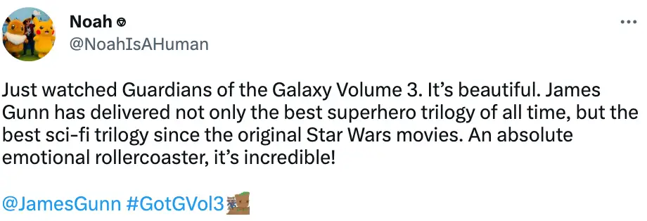 One fan tweeted the utmost praise for Gunn and the film and called it one of the best trilogies since Star Wars.