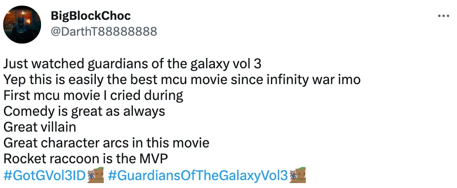 “Just watched this and I gotta say Guardians of the Galaxy Volume 3 is the best Marvel movie in phase 4,” the Twitter user shared. “An absolute emotional rollercoaster!! you'll laugh then you cried. it's a very great conclusion to the trilogy. I love it so much!!”
