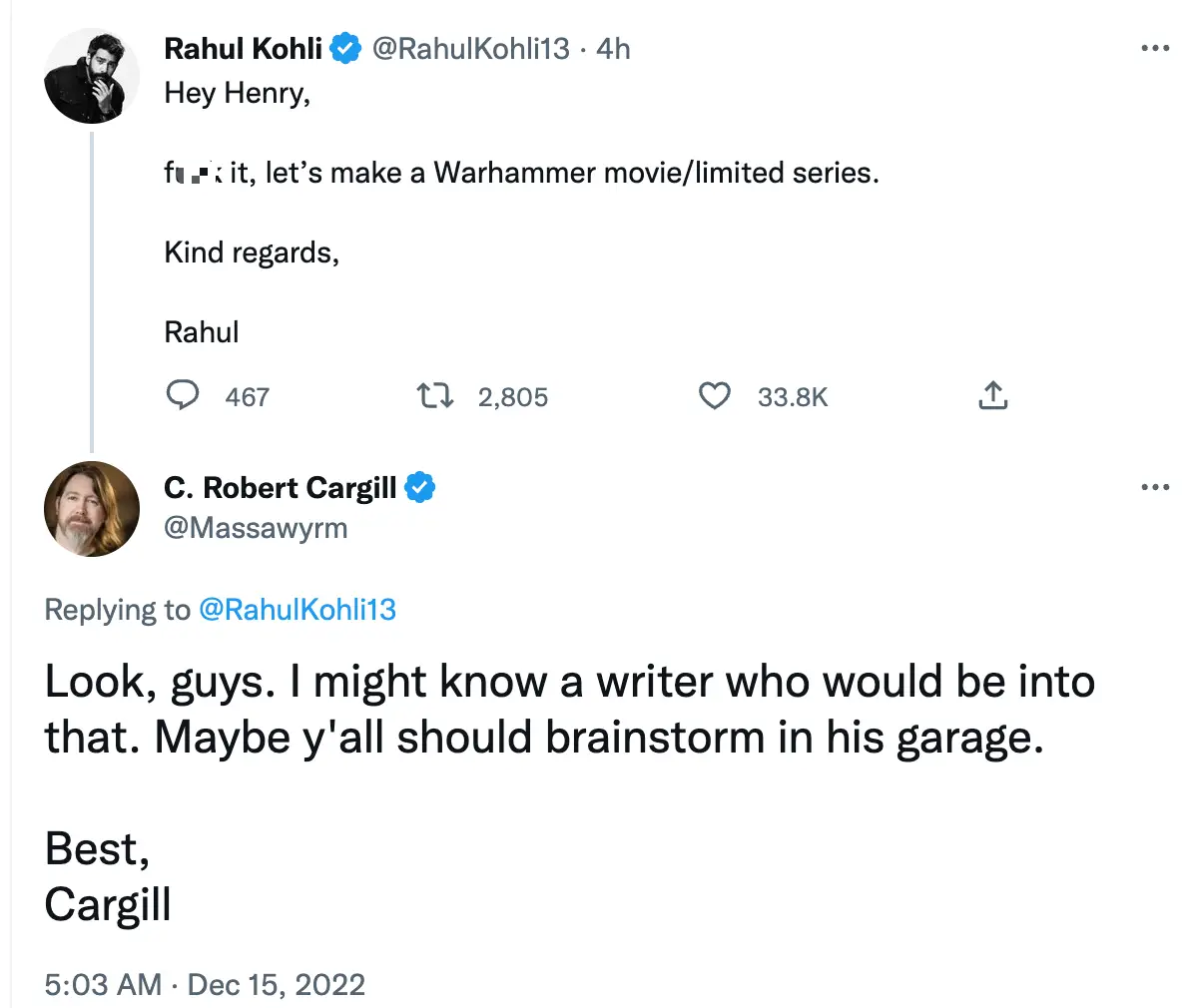 Actor Rahul Kohli, who has starred in iZombie and Netflix’s Midnight Mass, tweeted: “Hey Henry, f**k it, let’s make a Warhammer movie/limited series. Kind regards, Rahul.”