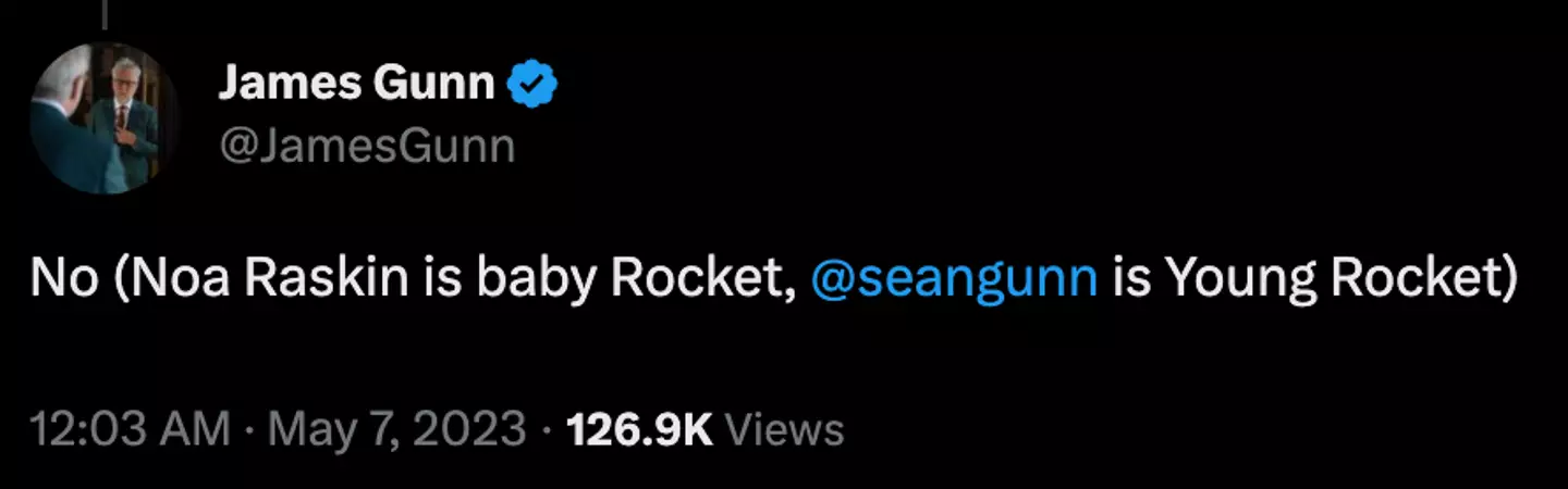Gunn replied and wrote: “No (Noa Raskin is baby Rocket, @seangunn is Young Rocket)”