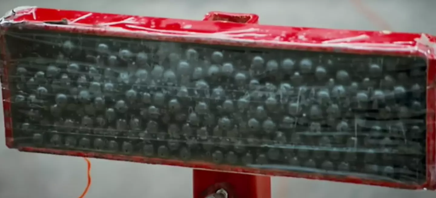The machine is basically an explosive non-lethal mine that shoots approximately 700 45-calibre rubber balls at 500 feet per second.