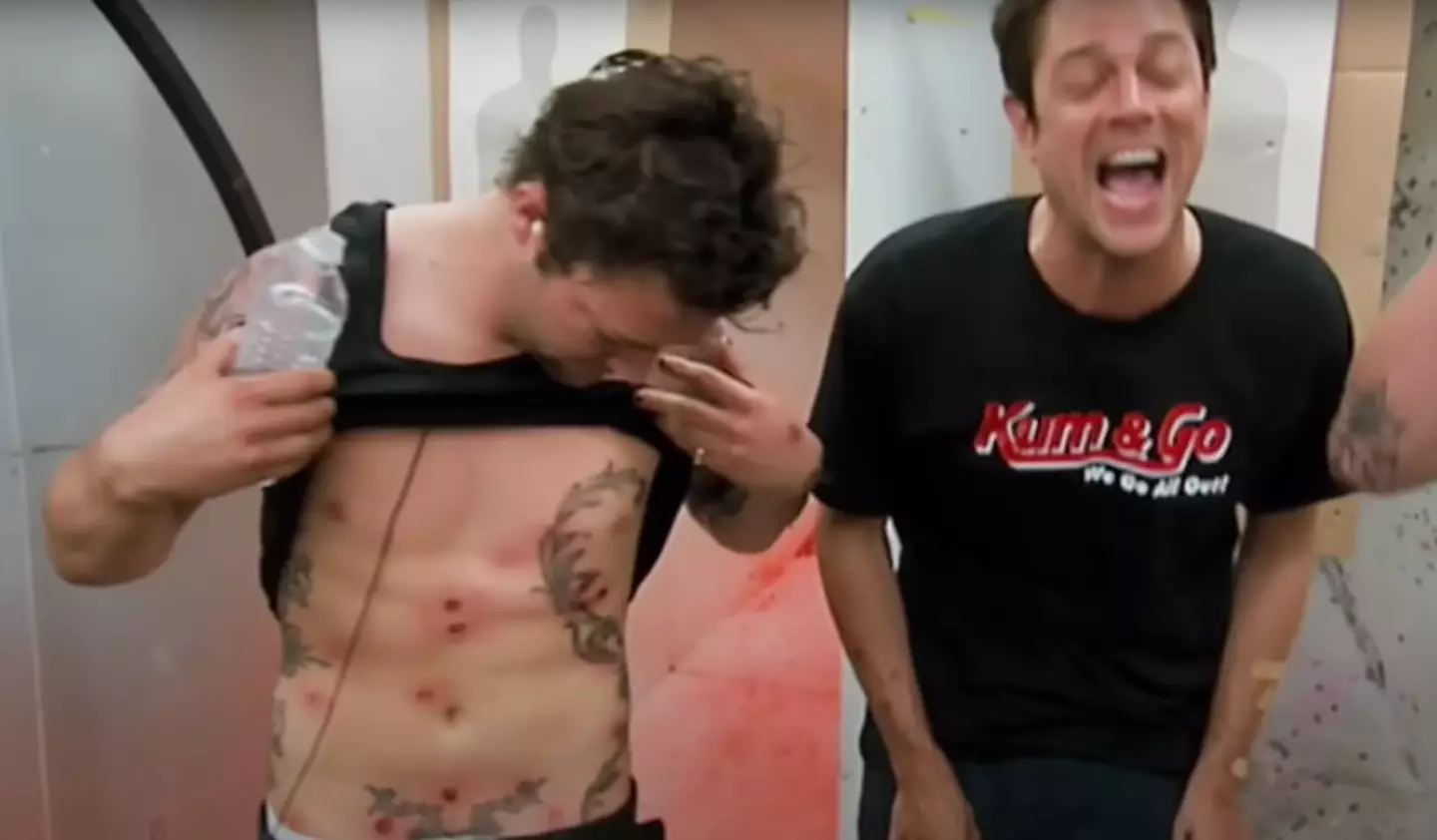 Well in one scene we witness Ryan Dunn, Knoxville and Margera who put themselves in the firing line of a 'riot control test'.