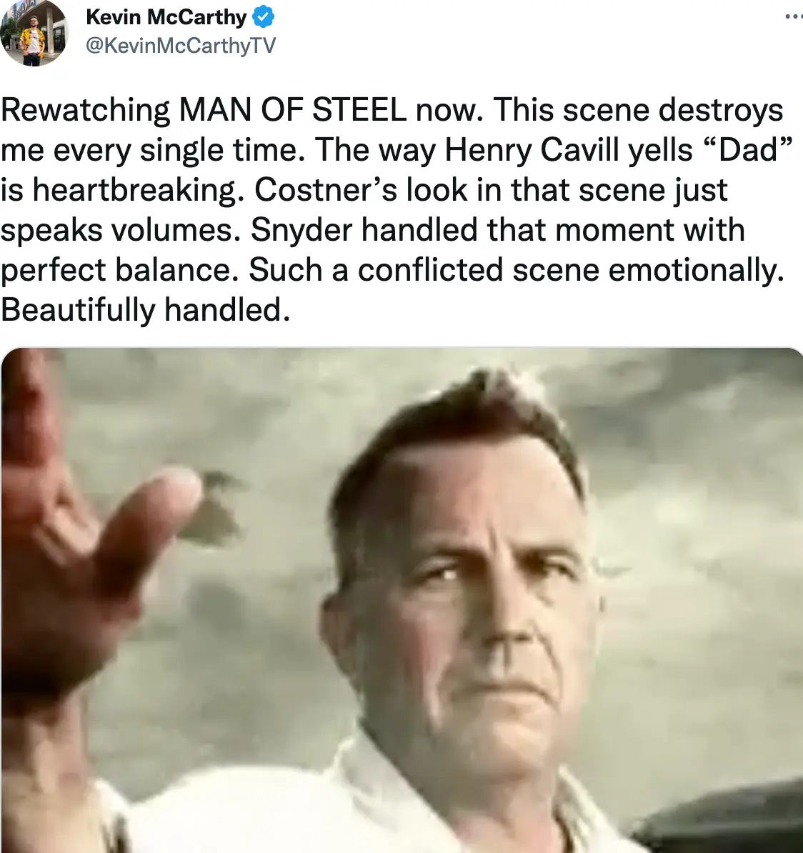 Podcast host Kevin McCarthy tweeted his love for a scene from the film in which Clark Kent and his adoptive human father Jonathan Kent.