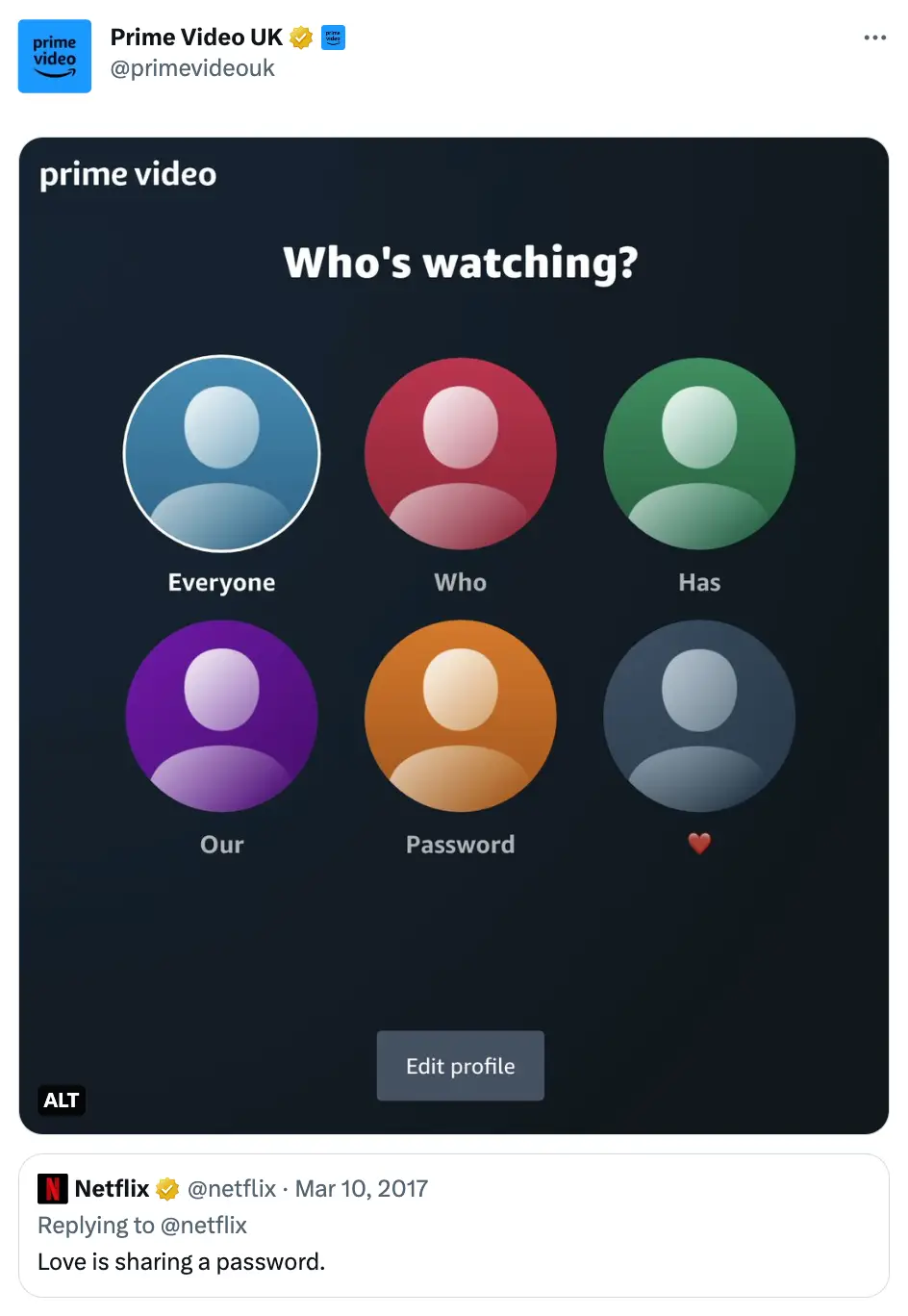 Amazon Prime Video quote-tweeted the old Netflix tweet with an edited version of its profile interface. The ‘who’s watching?’ prompt is at the top of the picture as always but instead of having names underneath each profile, there’s a message directed at Netflix that reads: “Everyone who has our password,” with a love heart emoji under the sixth profile.