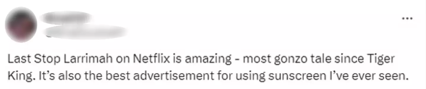 Echoing siminar sentiments, someone else said: "You’d be mistaken that this is a comedy, but it’s real, it’s bizarre and it’s all true!!! #LastStopLarrimah @netflix."
