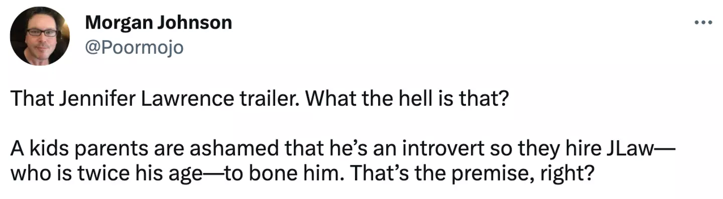 While another disappointed viewer took to Twitter and wrote: “That Jennifer Lawrence trailer. What the hell is that? A kids parents are ashamed that he’s an introvert so they hire JLaw—who is twice his age—to bone him. That’s the premise, right?