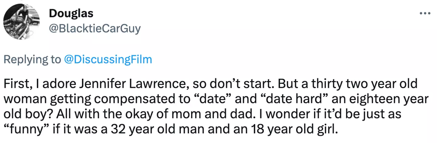 They tweeted: “First, I adore Jennifer Lawrence, so don’t start. But a thirty-two-year-old woman getting compensated to ‘date’ and ‘date hard’ an eighteen year old boy? All with the okay of mom and dad. I wonder if it’d be just as “funny” if it was a 32 year old man and an 18 year old girl.”