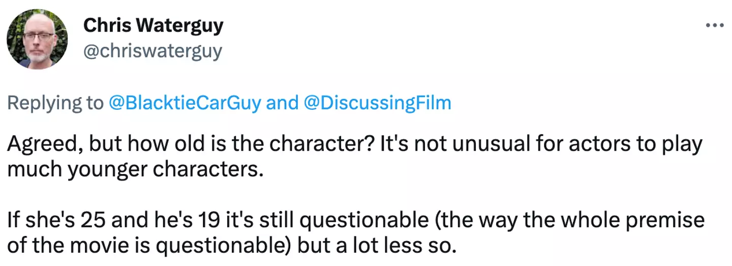 Another Twitter user agreed and called the movie’s plot ‘questionable’. They wrote: “Agreed, but how old is the character? It's not unusual for actors to play much younger characters. If she's 25 and he's 19 it's still questionable (the way the whole premise of the movie is questionable) but a lot less so.”