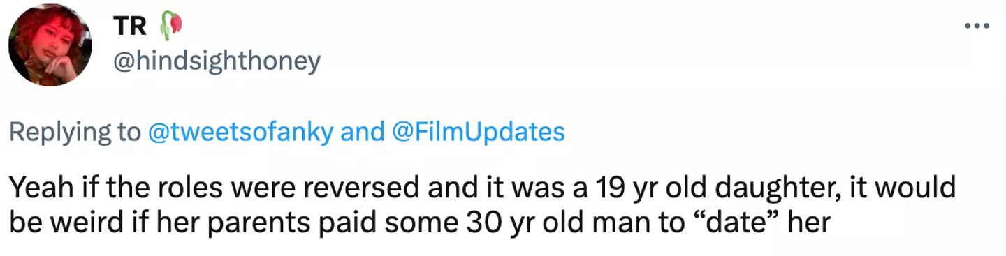 Lots of other Twitter users have issues with the plot for a similar reason. “Yeah if the roles were reversed and it was a 19 yr old daughter, it would be weird if her parents paid some 30 yr old man to ‘date’ her,” one user said.