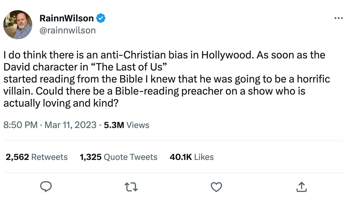 Rainn Wilson thinks there's 'an anti-Christian bias in Hollywood' after watching the latest episode of The Last of Us.