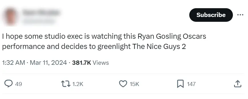 Another fan saw Gosling’s performance and took inspiration for the plot of the sequel, posting: “Make The Nice Guys 2 a musical I really don’t give a f**k.”