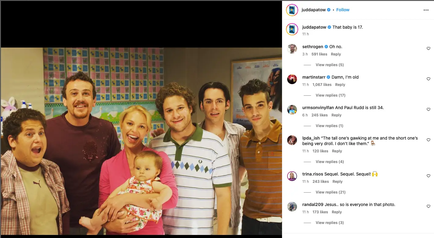 In the post, a young-looking Jonah Hill and Jason Segel could be seen alongside Seth Rogan and Katherine with the on-screen baby in her arms.