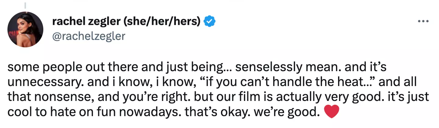 She wrote: “Some people out there and just being… senselessly mean. and it’s unnecessary. and I know, I know, ‘if you can’t handle the heat…’ and all that nonsense, and you’re right. but our film is actually very good. It’s just cool to hate on fun nowadays. that’s okay. we’re good.