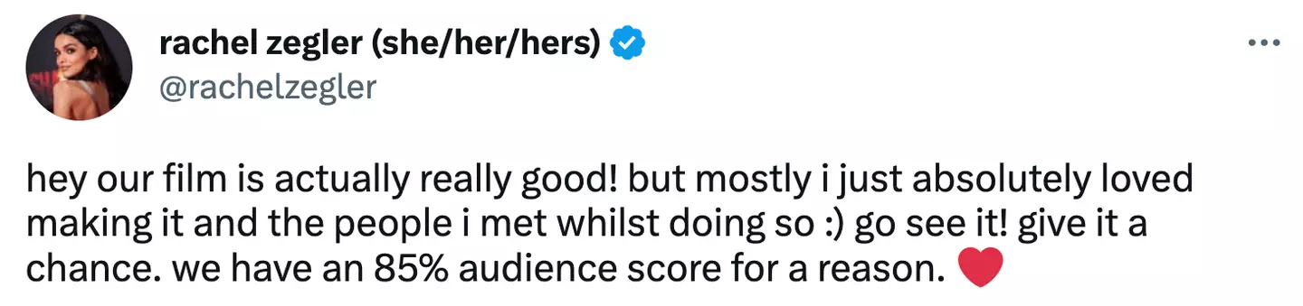 Zegler tweeted four behind the scenes snaps from the film and cited the overwhelmingly positive audience score on Rotten Tomatoes compared to the 187 reviews from critics.
