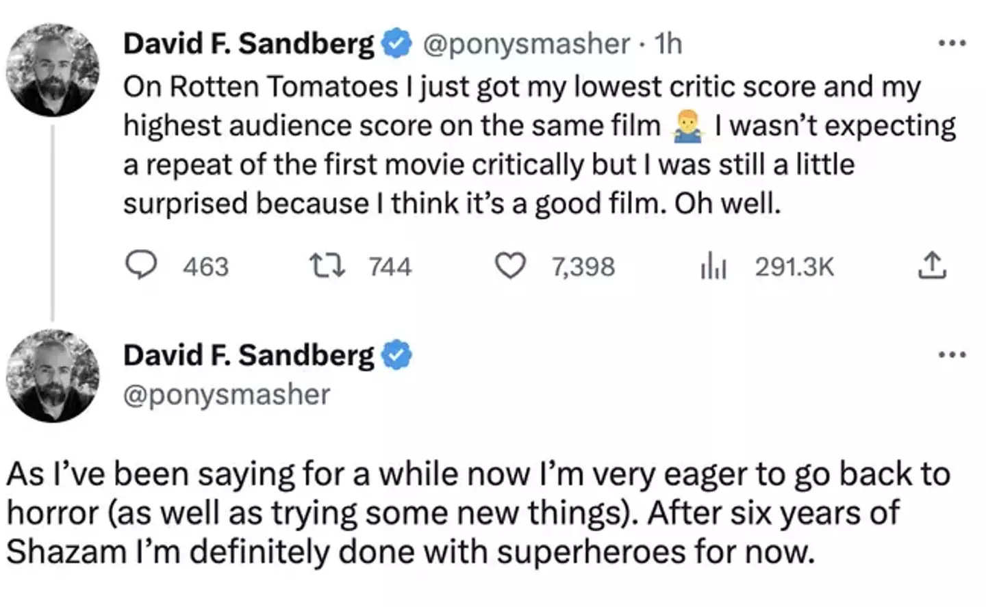 "As I’ve been saying for a while now I’m very eager to go back to horror (as well as trying some new things). After six years of Shazam I’m definitely done with superheroes for now."