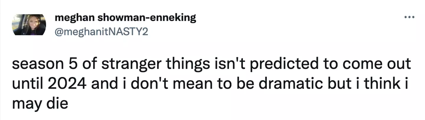 And a third wrote: “Season 5 of Stranger Things isn't predicted to come out until 2024 and I don't mean to be dramatic but I think I may die.”