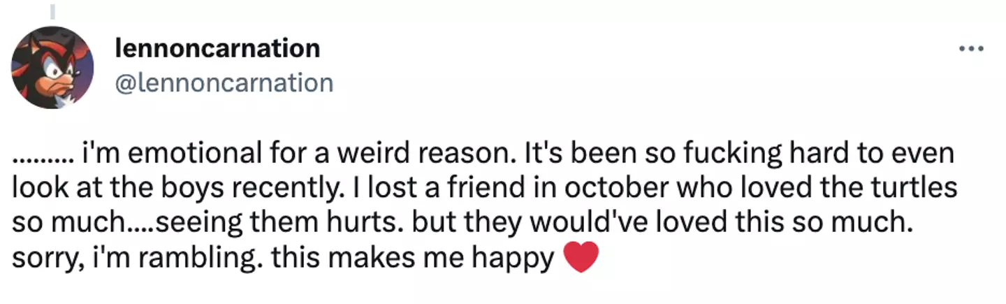 One fan replied: “......... I'm emotional for a weird reason. It's been so fucking hard to even look at the boys recently. I lost a friend in october who loved the turtles so much....seeing them hurts. but they would've loved this so much. sorry, I'm rambling. this makes me happy.”