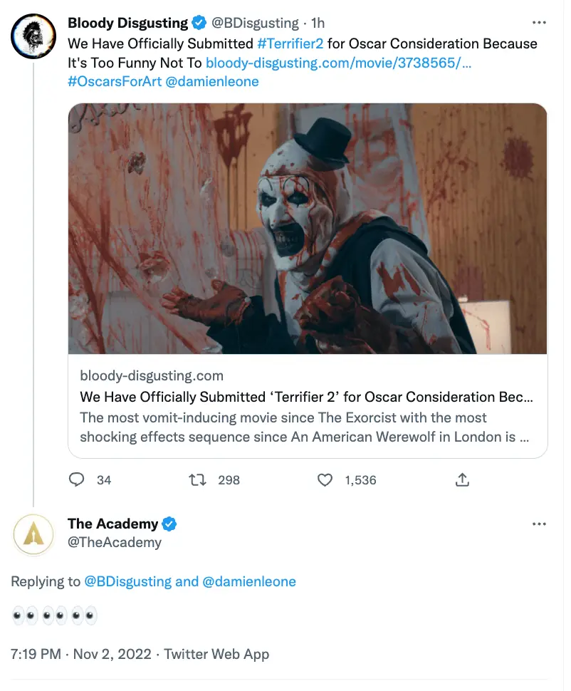 And The Academy has noticed - responding to the post announcing the news from Bloody Disgusting, the official Academy Twitter account posted several eye emojis.