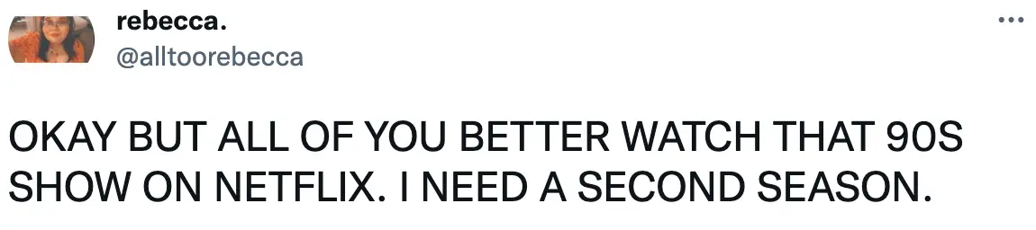 A fourth fan urged people to watch the show to ensure it comes back. "OKAY BUT ALL OF YOU BETTER WATCH THAT '90S SHOW ON NETFLIX. I NEED A SECOND SEASON," they demanded.