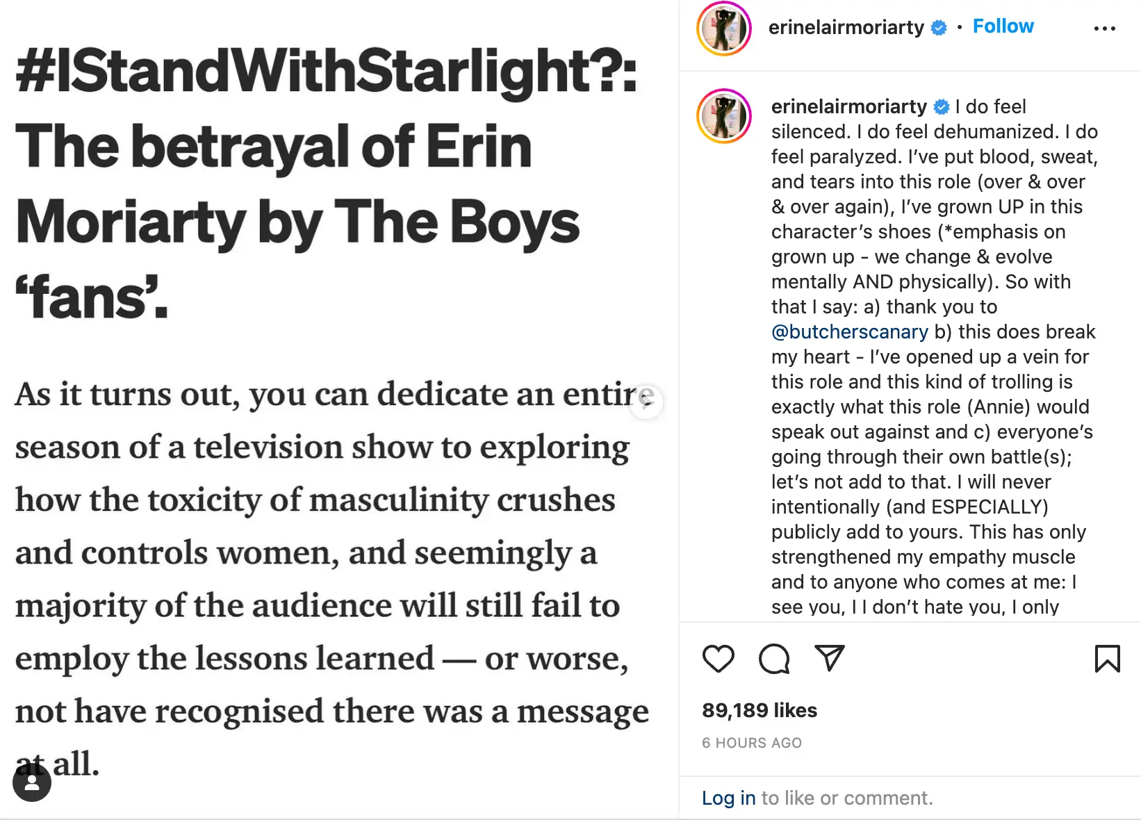 On Tuesday (6 September) Moriarty shared a Medium article titled: #IStandWithStarlight?: The Betrayal of Erin Moriarty by The Boys Fans, which was written by a person using the handle @butcherscanary.