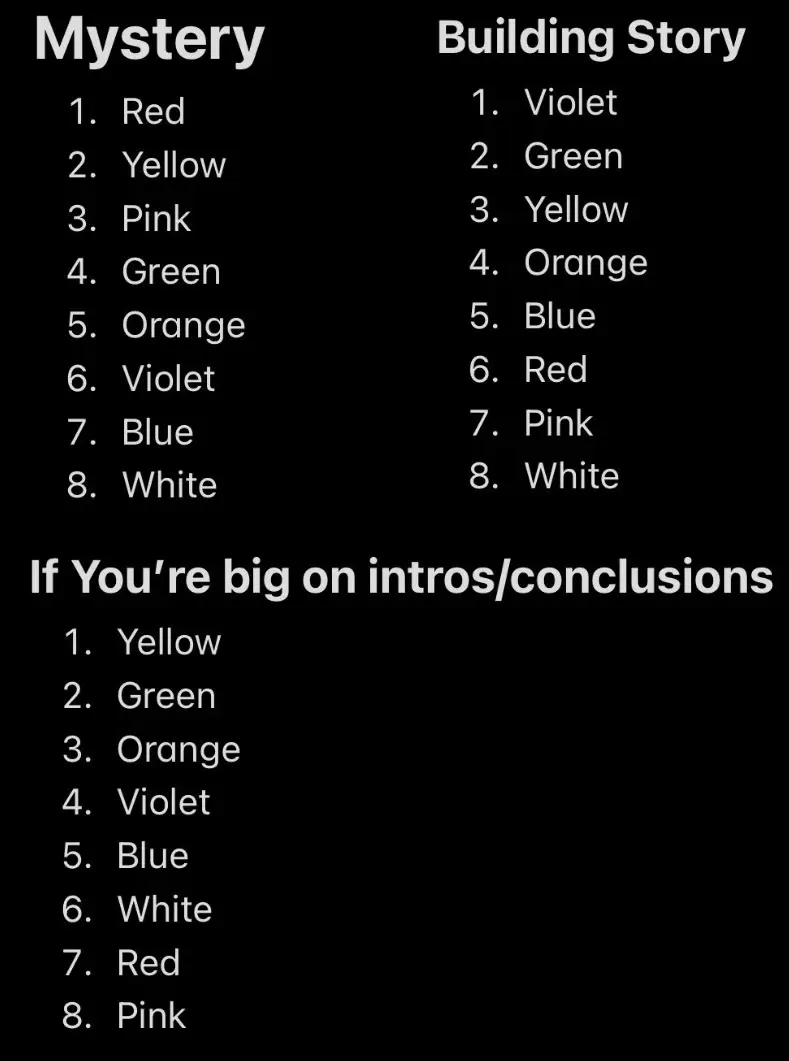Meanwhile, Yellow, Green, Orange, Violet, Blue, White, Red and Pink is great for people who are big on introductions and conclusions, and so on.