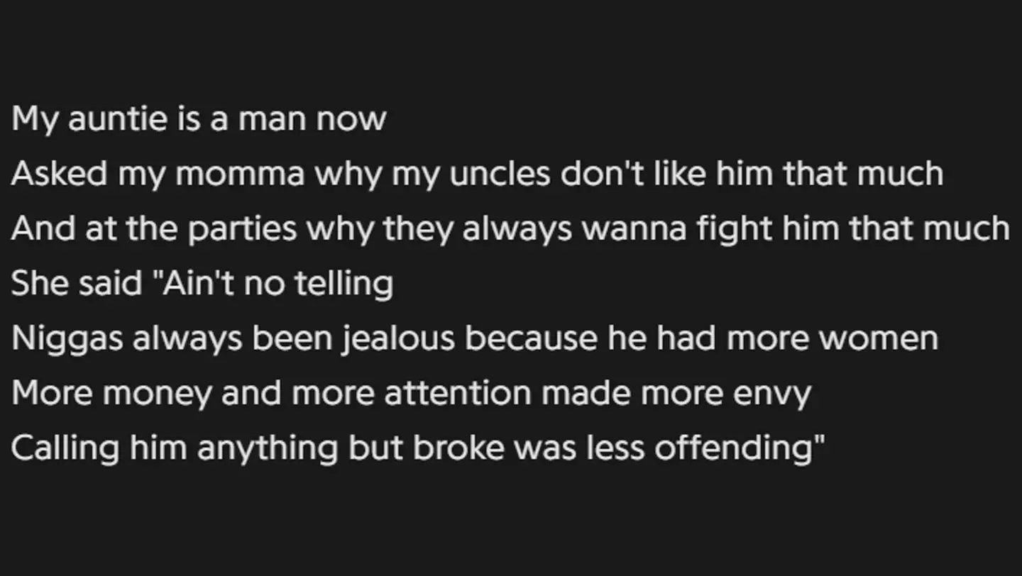 The first half of the track sees Lamar talk about his relationship with his transgender ‘aunt’ growing up and how they provided him with an early source of inspiration, claiming that they 'cut my hair at the pad, was loving my fade/The first person I seen write a rap/That's when my life had changed.”