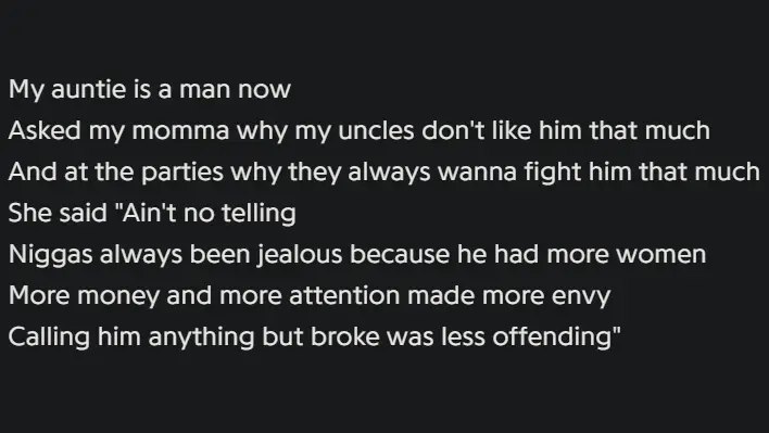 The first half of the track sees Lamar talk about his relationship with his transgender ‘aunt’ growing up and how they provided him with an early source of inspiration, claiming that they 'cut my hair at the pad, was loving my fade/The first person I seen write a rap/That's when my life had changed.”