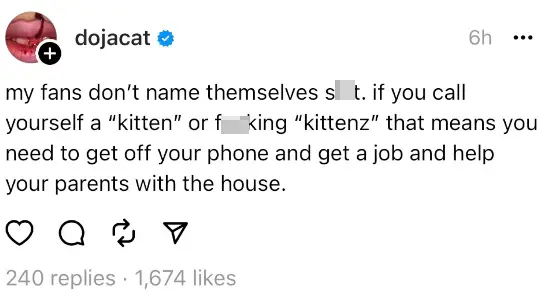 Doja Cat has blasted her fans for using a nickname to refer to her fanbase.