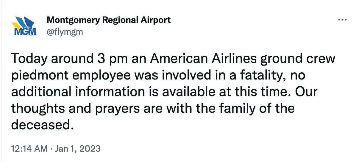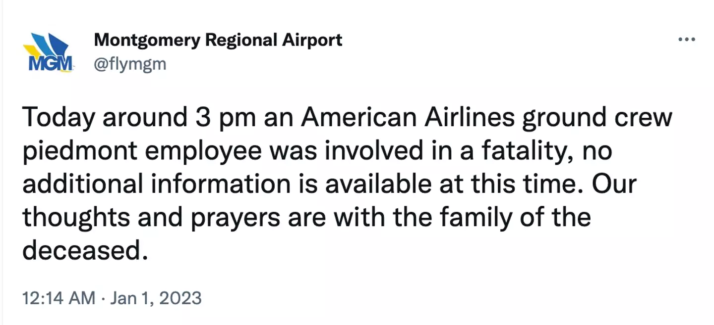 The unidentified victim died on New Year's Eve (31 December) at Montgomery Regional Airport in Alabama while working on the ramp of a departing plane.