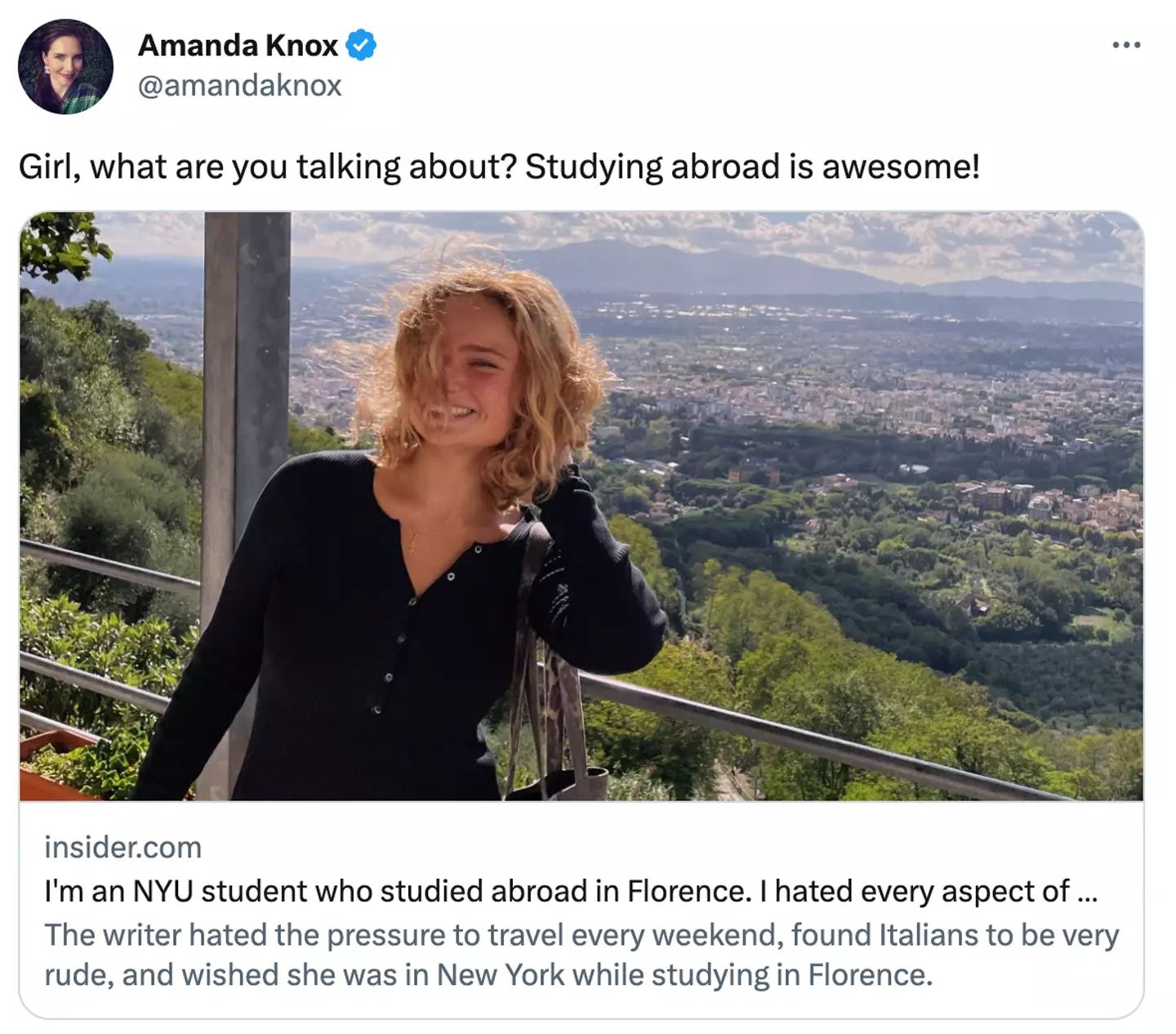 Knox, 34, who now works as a journalist, retweeted an article this week, written by NYU student Stacia Datskovska, who claims she 'hated every aspect' of her semester abroad.
