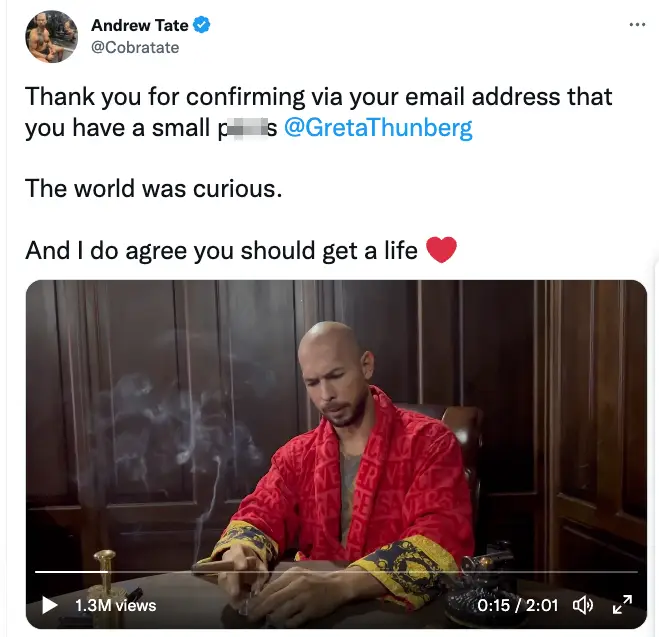 In the two-minute video, viewed more than one million times within an hour of posting, Tate lashed out at Thunberg and went in for the attack all over again.