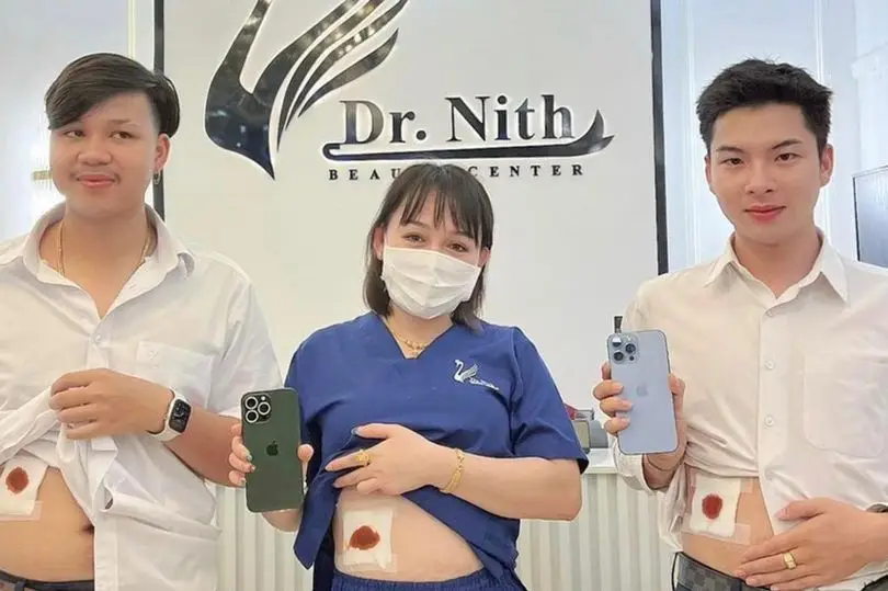 A viral image posted by a beauty clinic in Laos shows a group of people holding up their new iPhone, while displaying their 'surgical scars', after supposedly selling their kidneys in return for a smartphone.