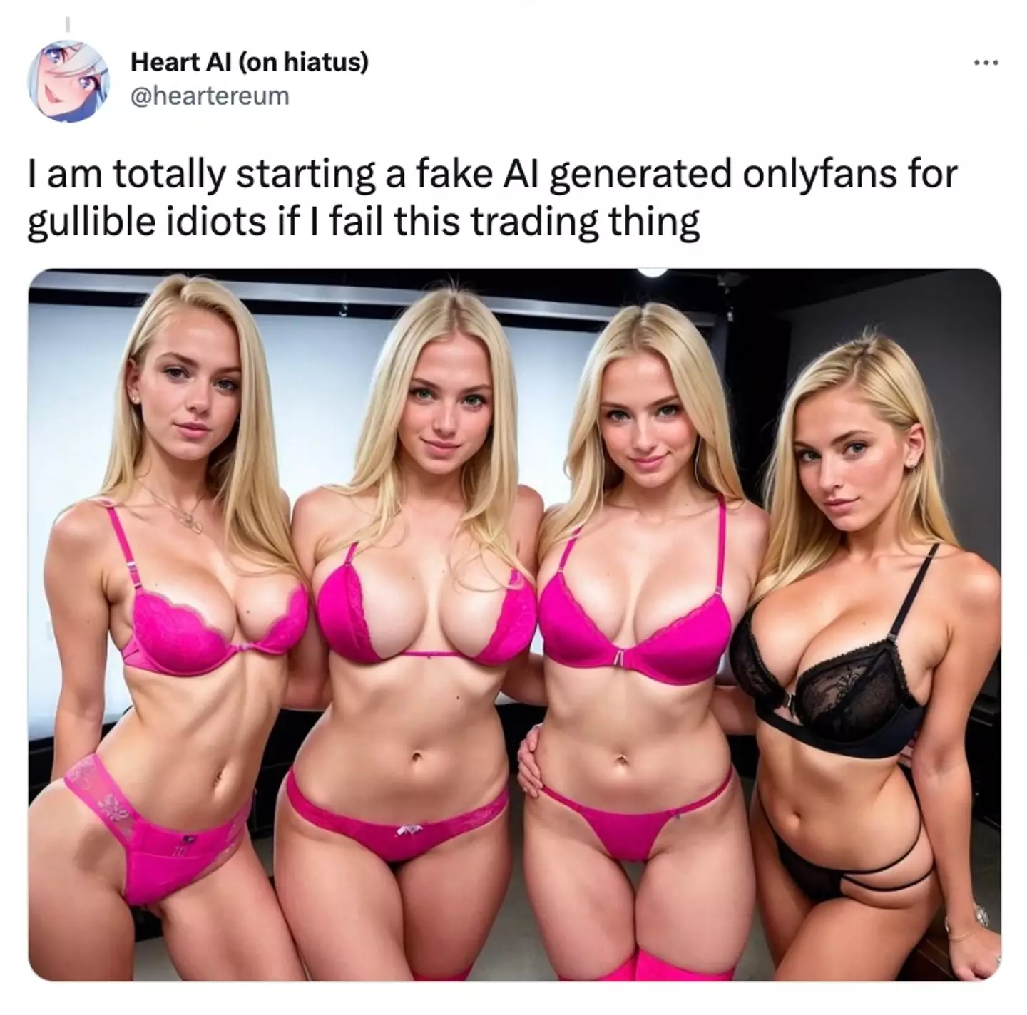 The Twitter user went on to say: "I am totally starting a fake AI generated OnlyFans for gullible idiots if I fail this trading thing...