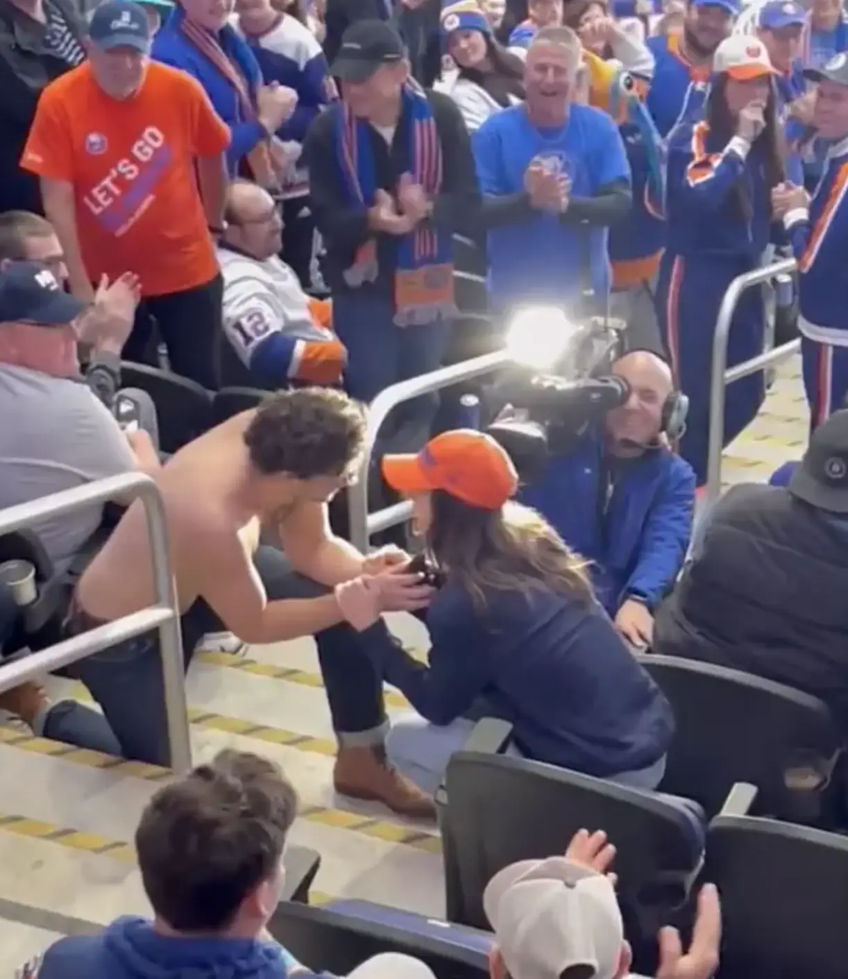 It all went down when the infamous kiss cam landed on the couple, and the man seized the moment to get down on one knee - while wearing no shirt, yes.