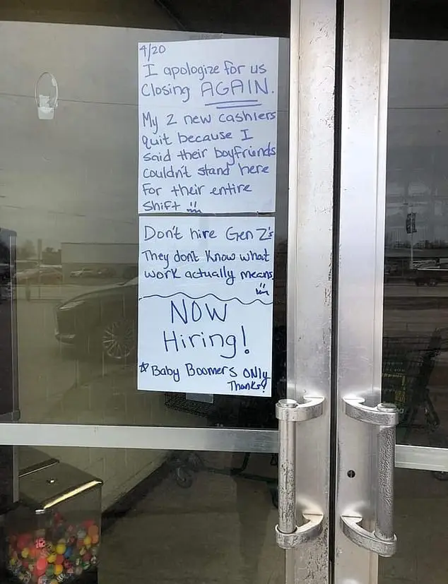"My two new cashiers quit because I said their boyfriends couldn't stand here for their entire shift," the note continued. "Don't hire Gen Z's – they don't know what work actually means. Now hiring! Baby boomers only."