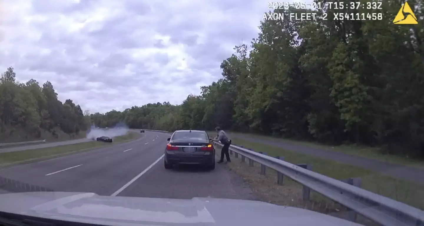 In dash cam footage, shared by Fairfax County Police Department, an unnamed cop can be seen performing a routine traffic stop with a gray 2012 BMW 750 Series.