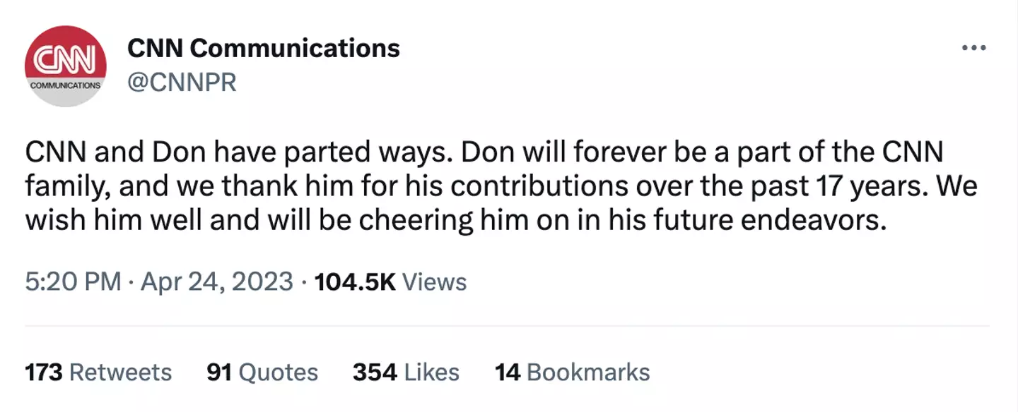 The official CNN Communications Twitter page also released a statement on the matter, stating: "CNN and Don have parted ways.