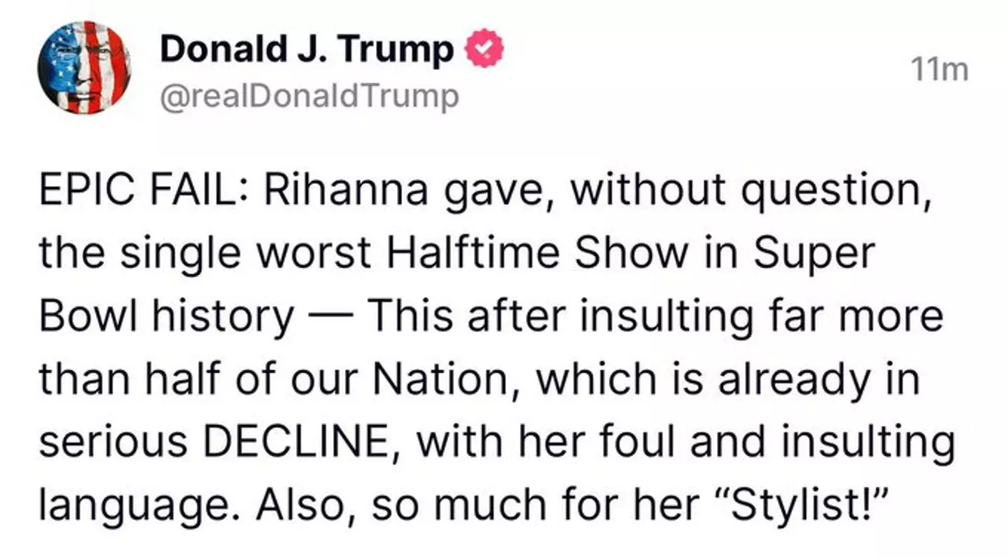 So, it's no surprise that Trump has posted on Truth Social to give his two cents about Rihanna's Super Bowl Halftime Show.