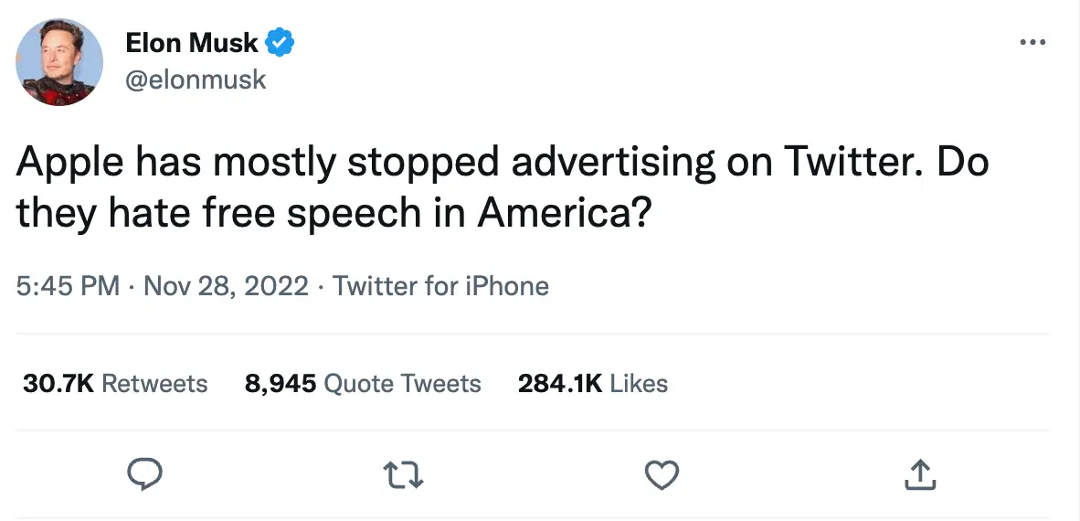 “Apple has mostly stopped advertising on Twitter,” he said, asking: “Do they hate free speech in America?"