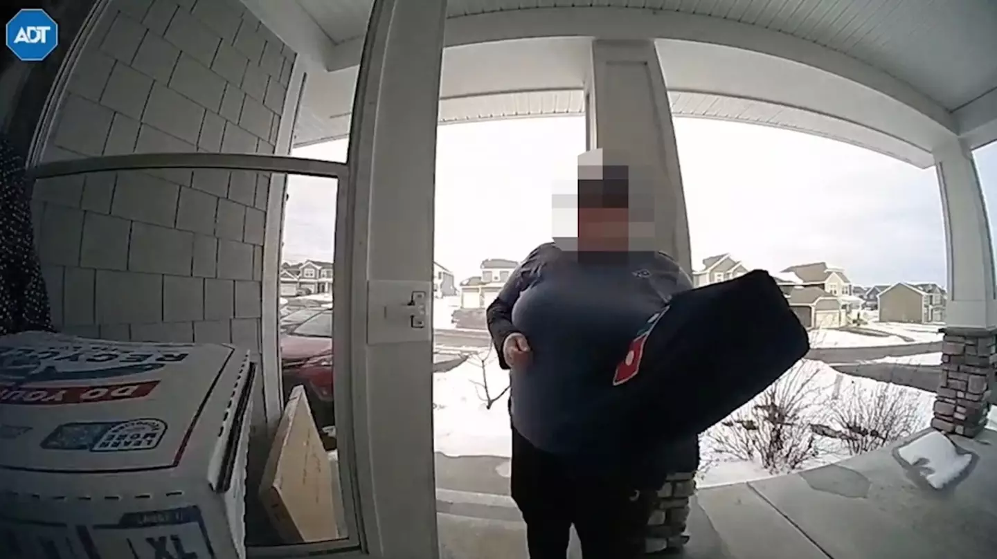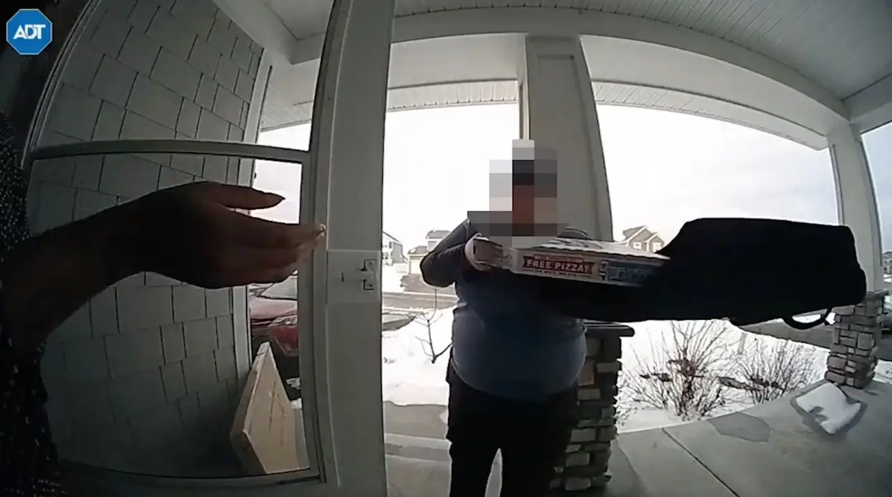 In the video, the delivery driver passes over the pizza box at the same tip as curtly stating: "Tip."