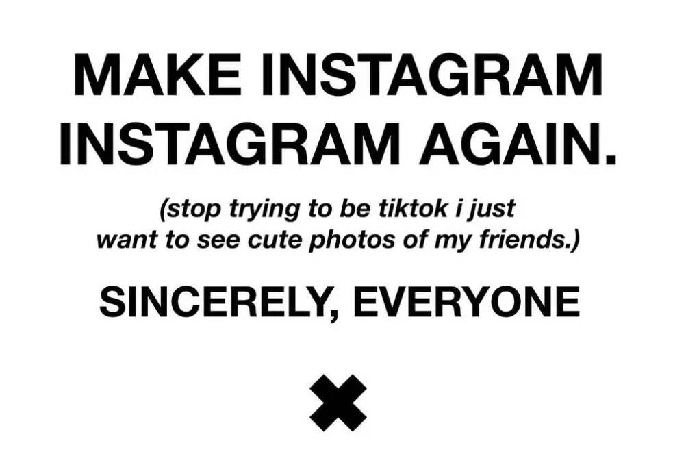 "Make Instagram Instagram again," the message says. "Stop trying to be like TikTok, I just want to see cute photos of my friends, sincerely everyone."