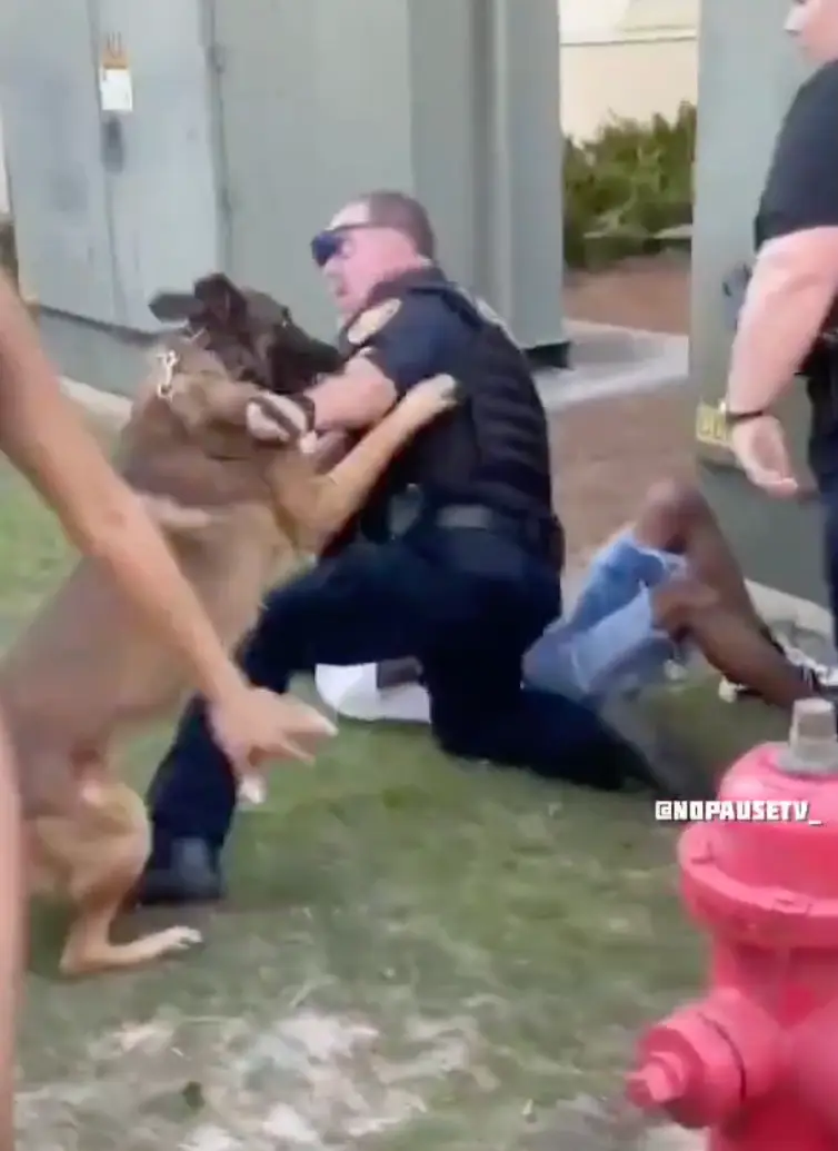 The officer tackles him to the floor whilst still holding the K-9’s collar. Onlookers can be heard screaming, “What are you doing? He didn’t do anything?”