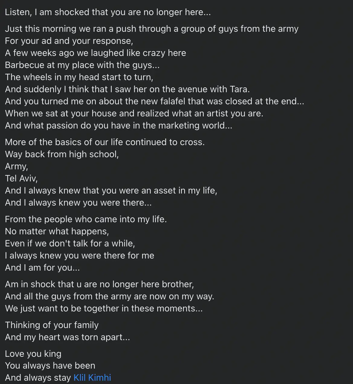 While another wrote: “Kalil, we will always remember you and your special charm, really the world lost a super unique person! May your memory be a blessing.”