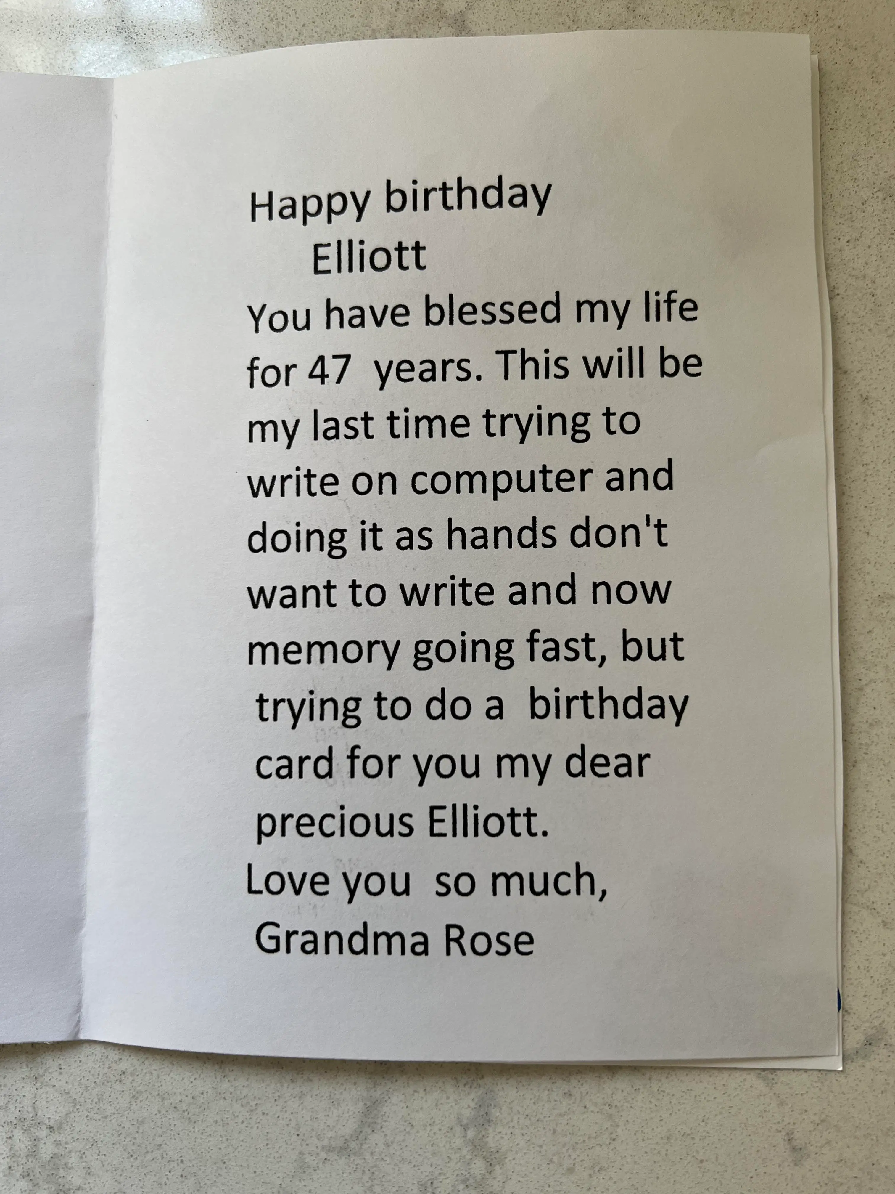 The emotional message read: “Happy birthday Elliott. You have blessed my life for 47 years. This will be my last time trying to write on computer and doing it as hands don’t want to write and now memory going fast, but trying to do a birthday card for you my dear precious Elliott. Love you so much, Grandma Rose.”