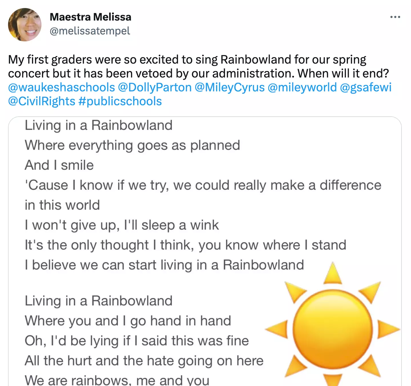 She shared: “My first graders were so excited to sing Rainbowland for our spring concert but it has been vetoed by our administration. When will it end? @waukeshaschools @DollyParton @MileyCyrus @mileyworld @gsafewi@CivilRights #publicschools.”