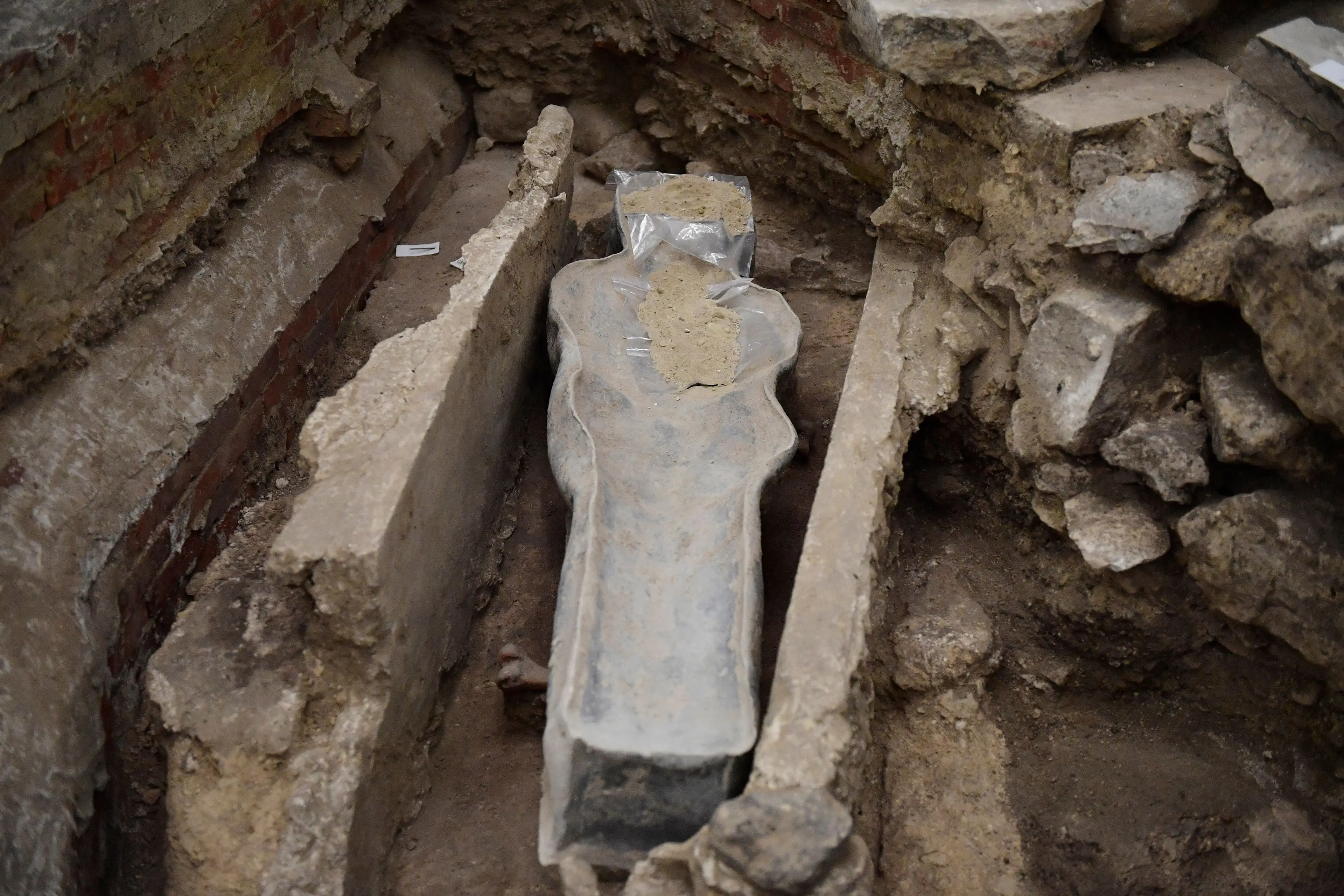 When the lead sarcophagus was discovered last month, archaeologists said it probably belonged to a high dignitary, and that it could date back to the 14th century.