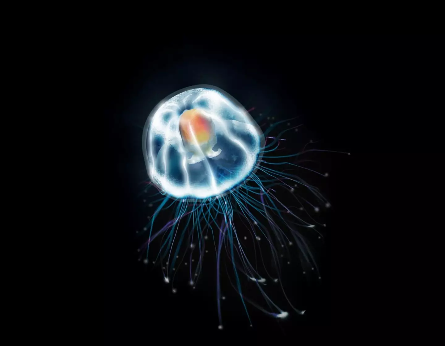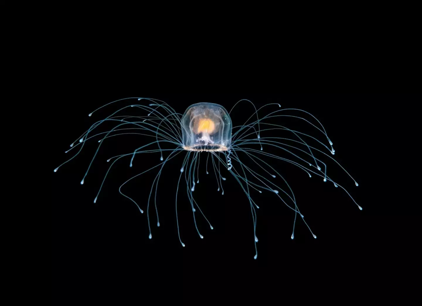 About as wide as your pinky nail, the 'immortal jellyfish' returns to its polyp stage over a three-day period, transforming its cells into a younger state so it will eventually grow into adulthood all over again.