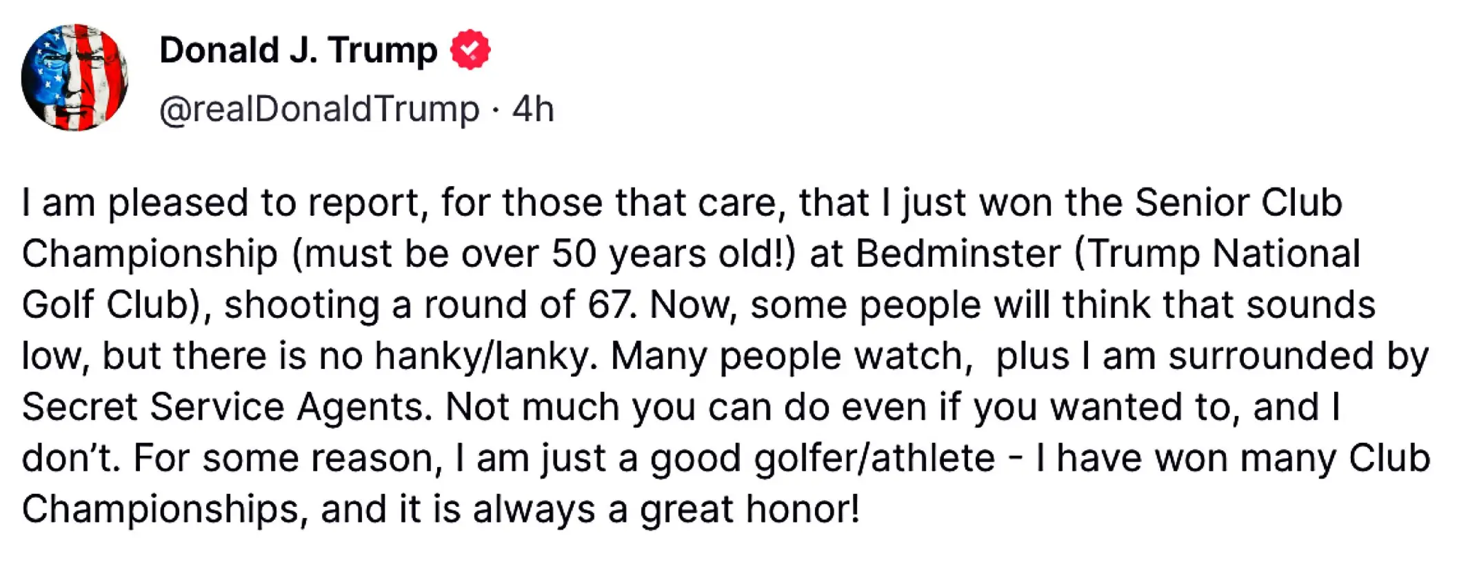 “I am pleased to report, for those that care, that I just won the Senior Club Championship (must be over 50 years old!) at Bedminster (Trump National Golf Club), shooting a round of 67,” Trump wrote on Truth Social.