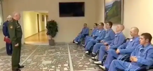 In the footage, which was broadcast by Kremlin-controlled Channel One, Russian deputy defence minister Alexander Fomin could be seen meeting with the soldiers and praising them for their service, saying ‘I serve Russia’ as he stood before them.